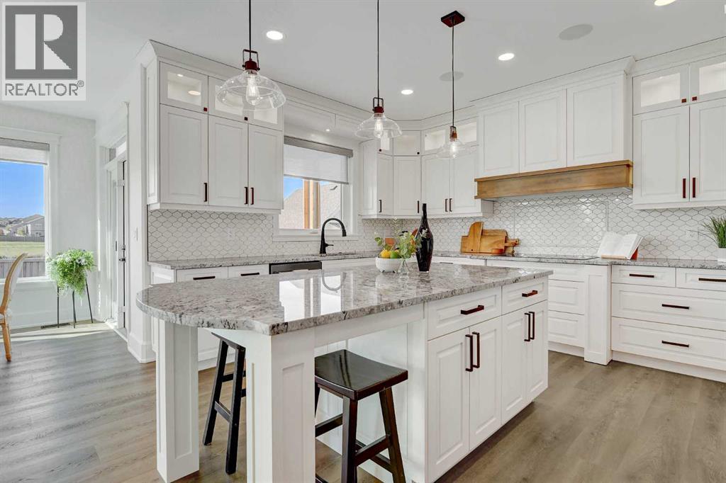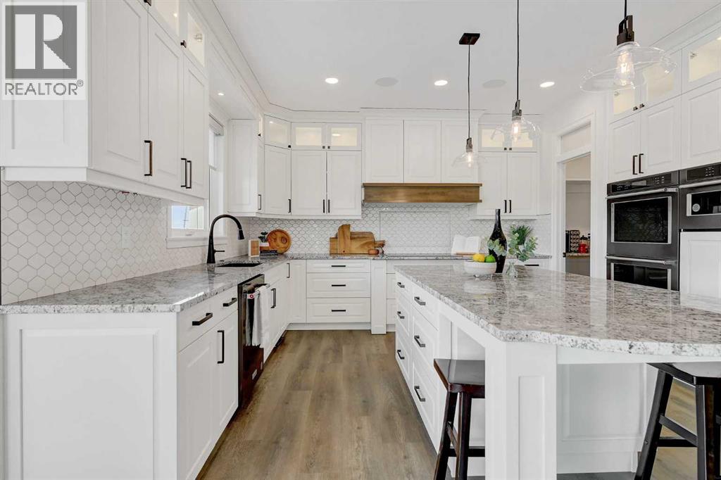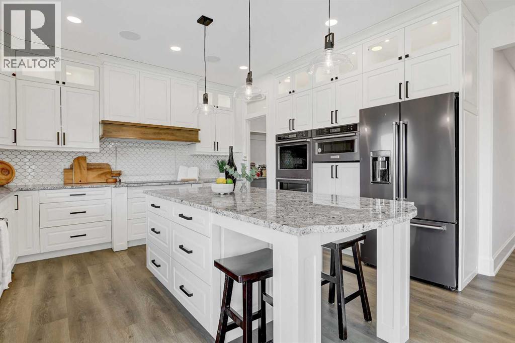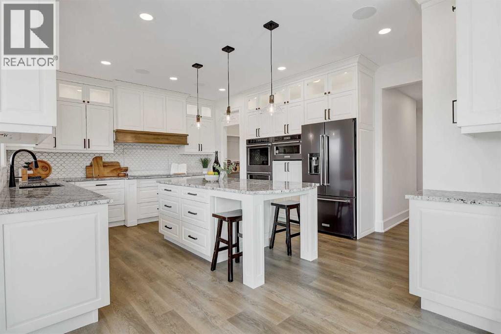 Every detail of this custom-built home in Whispering Ridge has been thoughtfully built to impress, and it does, from the moment you walk through the front door! Set on a 72' x 167' lot with no rear neighbours and county taxes,this property backs onto the pond and walking trails, offering privacy,beauty,and space to breathe.Coffered ceilings and a statement chandelier make an unforgettable first impression. The living room is bright and welcoming, with three large windows that fill the space with natural light.A gas fireplace with a custom maple mantle adds warmth and character,while the coffered ceilings with uplighting bring added dimension.From here,the formal dining room flows beautifully, a space that feels both elegant and inviting. Custom wall moulding, a striking chandelier, and oversized triple windows make it ideal for large gatherings. At the heart of the home, the refined kitchen brings together form and function with stunning results. Cream toned maple cabinetry, granite counters, and a truly massive island make it a natural gathering place. High end appliances include double ovens, an induction cooktop, and a built-in double freezer that blends seamlessly with the custom cabinetry. The butler’s pantry keeps everything tucked away, and a casual dining nook surrounded by windows makes the most of the scenery, with a door leading to the back deck, made for summer meals outside (deck to be completed). A full bathroom with dual access connects to a spacious main floor bedroom — ideal for guests, multigenerational living, or a refined home office. The rear entry adds style and function with custom built lockers, shelving, and hooks. Upstairs, custom built newel posts lead to a primary suite that feels like a private retreat! The bedroom is generous in size, with a sitting area framed by three windows overlooking the pond and trails. Step out onto your private balcony, designed for a hot tub or morning coffee. The ensuite features heated tile floors, dual vani ties, custom storage towers, an air tub, water closet, and a massive tiled shower with rain head and body sprays. The walk-in closet includes built ins, an island, and a laundry chute. Upstairs also features two large bedrooms and a bath with dual sinks and cheater access. Downstairs, heated floors run throughout and the expansive family room is anchored by a wet bar. The custom theatre is a showstopper, with real constellations, tiered seating, and a mural by a local artist. Two bright bedrooms and a full bath complete the level. The backyard is made for summer evenings, with a stamped concrete fire pit pad and no rear neighbours, perfect for hosting friends! The finished triple garage is a true standout, with easy clean metal walls, epoxy floors, and floor drains in every bay. Triple-pane windows, dual furnaces, A/C, smart lighting, and custom finishes throughout — this home is luxurious, practical, and one-of-a-kind. Call your REALTOR® today to book your private showing. Ask your realtor for list! (id:63357)