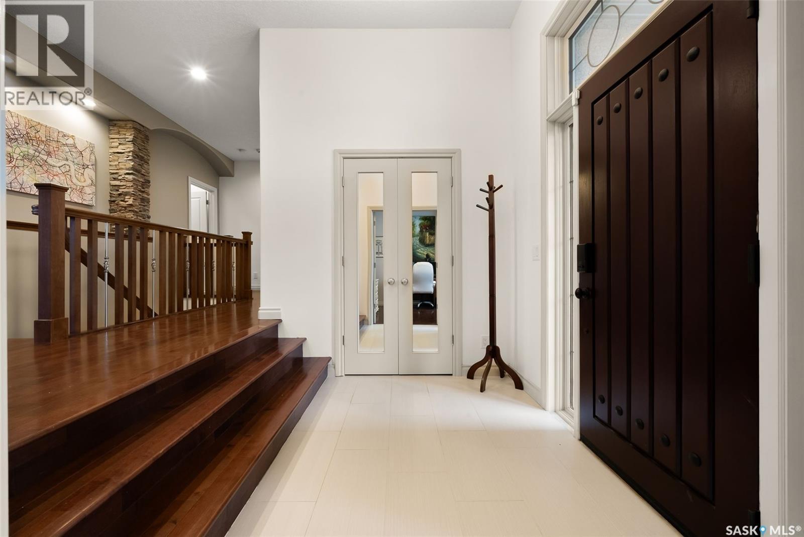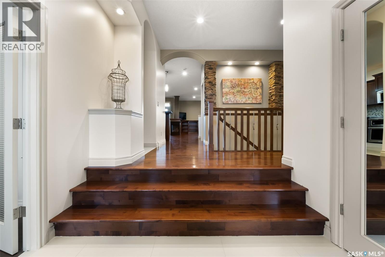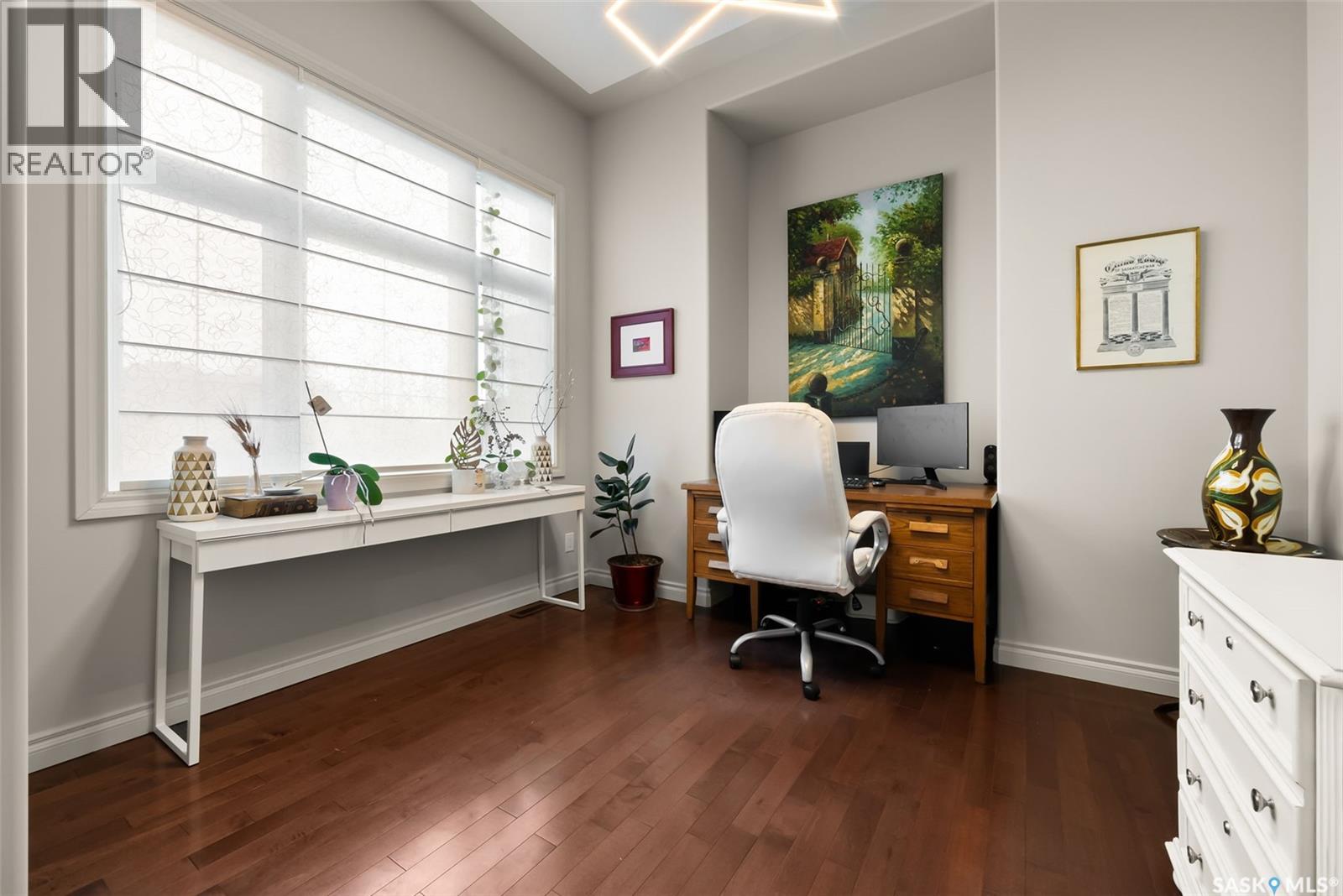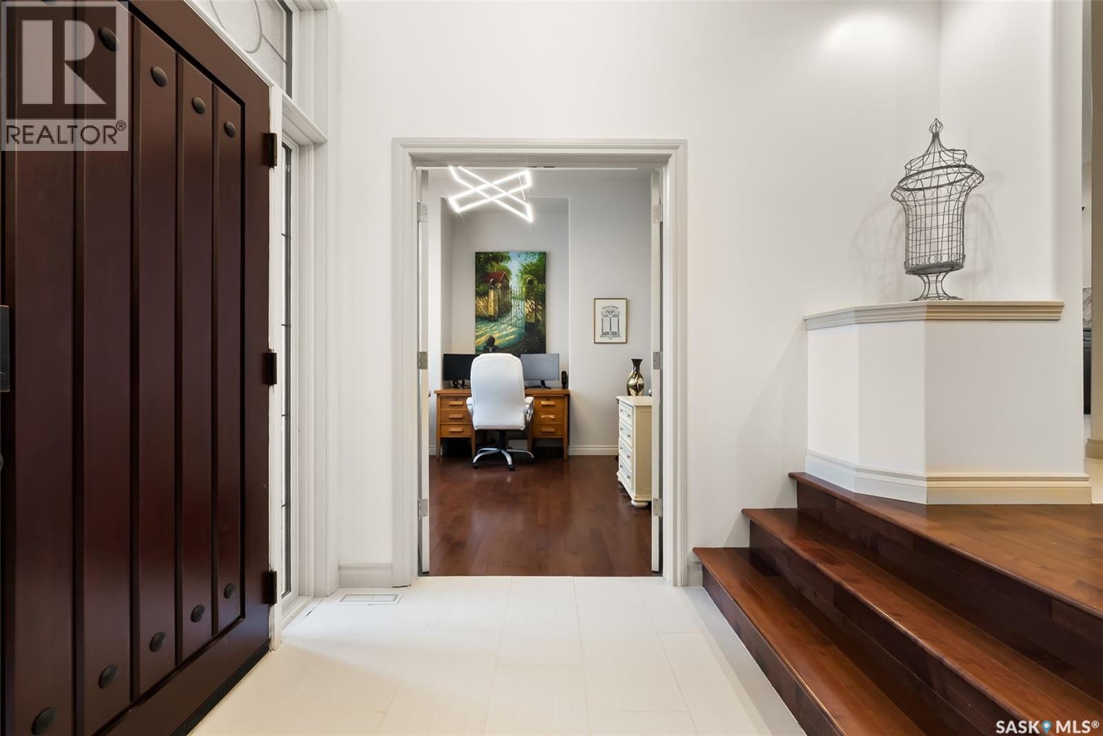 This executive 1,791 sq. ft. bungalow delivers a bright, open layout with 9-ft ceilings, sharp architectural lines, stacked-stone accents and warm recessed lighting. The front entry sets the tone with a rich, oversized door leading into a spacious sunken foyer and a private den or office accented with double glass doors. Hardwood floors carry through to the main living and dining area, centered around a 3-sided gas fireplace and full southern exposure overlooking the golf course. The kitchen is built for everyday function and entertaining, with custom maple cabinetry, granite countertops, herringbone backsplash, tile floor, a raised eating bar, corner pantry and clean pendant lighting. The primary suite also enjoys that southern light and features upgraded carpet, a walk-in closet and a renovated 5-piece ensuite with gorgeous soaker tub and a marvelous walk in shower. A large second bedroom and a full 4-piece bath finish the main floor. Downstairs, the fully developed basement offers a massive rec room with custom cabinets for all of your storage needs, a roughed-in wet bar, two additional bedrooms and another refreshed full 4 piece bathroom. Outside, everything is finished for you. The yard is fully landscaped with mature grass, a large storage shed and an uninterrupted view of the golf course. The attached heated triple garage has 13-ft ceilings, a floor drain, direct entry to the home, a man door to the yard and RV parking beside it. This home is completely turn-key and ready for its next owner. Book your showing today and come see what White City has to offer. As per the Seller’s direction, all offers will be presented on 11/23/2025 3:00PM. (id:63357)