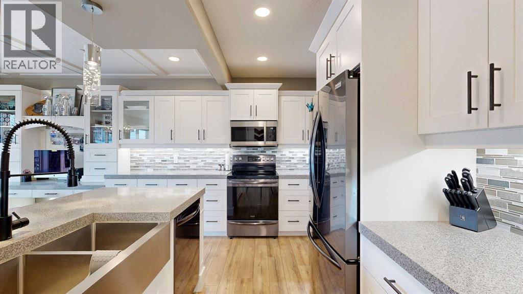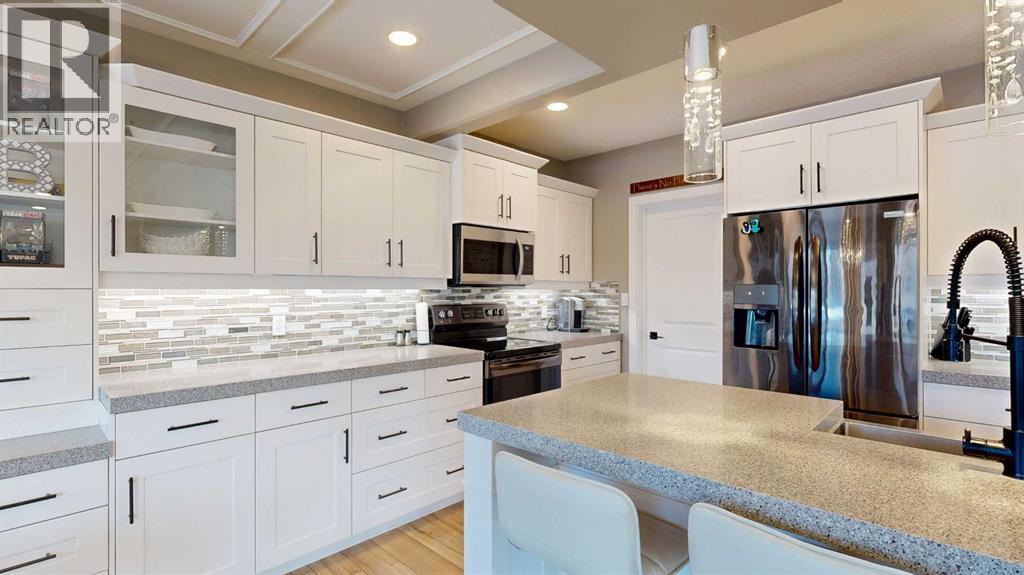 Park Lot! You’ll love this incredible location backing directly onto Rotary Park. This well-designed 2-storey home offers a fantastic open floor plan and over 3,000 sq. ft. of developed living space across all three levels.The spacious kitchen is beautifully finished with custom cabinetry, quartz countertops, under-cabinet lighting, and a pantry, making it perfect for both everyday living and entertaining. Just off the kitchen, step onto the 16’ x 12’ covered, maintenance-free deck featuring exposed aggregate and aluminum railings, ideal for year-round barbecuing and outdoor enjoyment. A convenient 2-piece bathroom completes the main level.Upstairs, you’ll find three bedrooms, two full bathrooms, and upper-level laundry, a layout designed with everyday convenience in mind. The primary ensuite features a 6-foot tub, separate shower, dual sinks, and a must-see walk-in closet with custom built-in cabinetry.The 26’ x 26’ heated garage offers excellent space, and the exterior is fully upgraded with an exposed aggregate driveway, front step, sidewalk, and town-approved RV parking beside the home. The yard is fully fenced.The finished basement adds even more living space with a fourth bedroom, an additional bathroom, and room to easily add a fifth bedroom if desired.This home truly has it all. (id:63357)