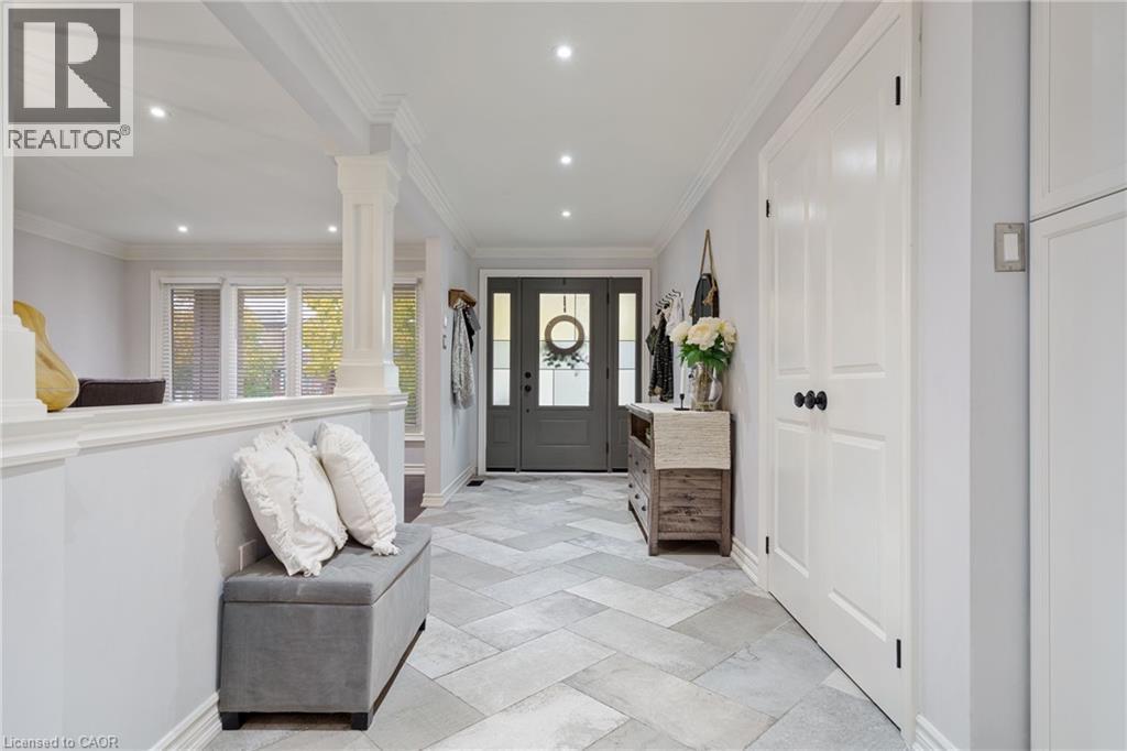 Welcome to this beautifully renovated all-brick 5-level backsplit offering over 2,000+ sq. ft. of finished living space, perfectly situated on a quiet, tree-lined street just steps from Ferris Park. This exceptional home blends timeless craftsmanship with modern upgrades and offers excellent in-law potential, featuring a separate entrance to the basement with a second kitchen already in place. The main level showcases a bright open-concept layout with hardwood maple flooring, crown moulding, and pot lights throughout. The stunning custom maple kitchen is a true showpiece, featuring solid soft-close cabinetry, dual sinks, a 9-ft quartz island, pot filler over the gas stove, under-cabinet lighting, glass backsplash and stainless steel appliances—striking the perfect balance of beauty and function. Just two steps down, the spacious family room welcomes you with a custom-built stone gas fireplace, ideal for gatherings or relaxing nights in. Conveniently located on this level is a 3-piece bath and a versatile rec room or fourth bedroom, perfect for guests, a home office, or playroom. The elegant wrought iron staircase connects all levels seamlessly. Upstairs, you’ll find three generous bedrooms and a beautifully renovated 4-piece bath with custom cabinetry and premium finishes. The fourth and fifth levels are partially finished, ready to unlock approximately 700+ sq. ft. on the fourth level and an additional 600 sq. ft. on the fifth, providing substantial potential to expand living space. Outside, enjoy a fully fenced backyard with an irrigation system, a two-car garage, and a wide private driveway. Recent updates include a new roof, air conditioning, and furnace (2023). Located close to parks, schools, transit, and shopping, with QEW access in under five minutes, this move-in-ready Stoney Creek home perfectly combines modern comfort, space, and style. (id:63357)