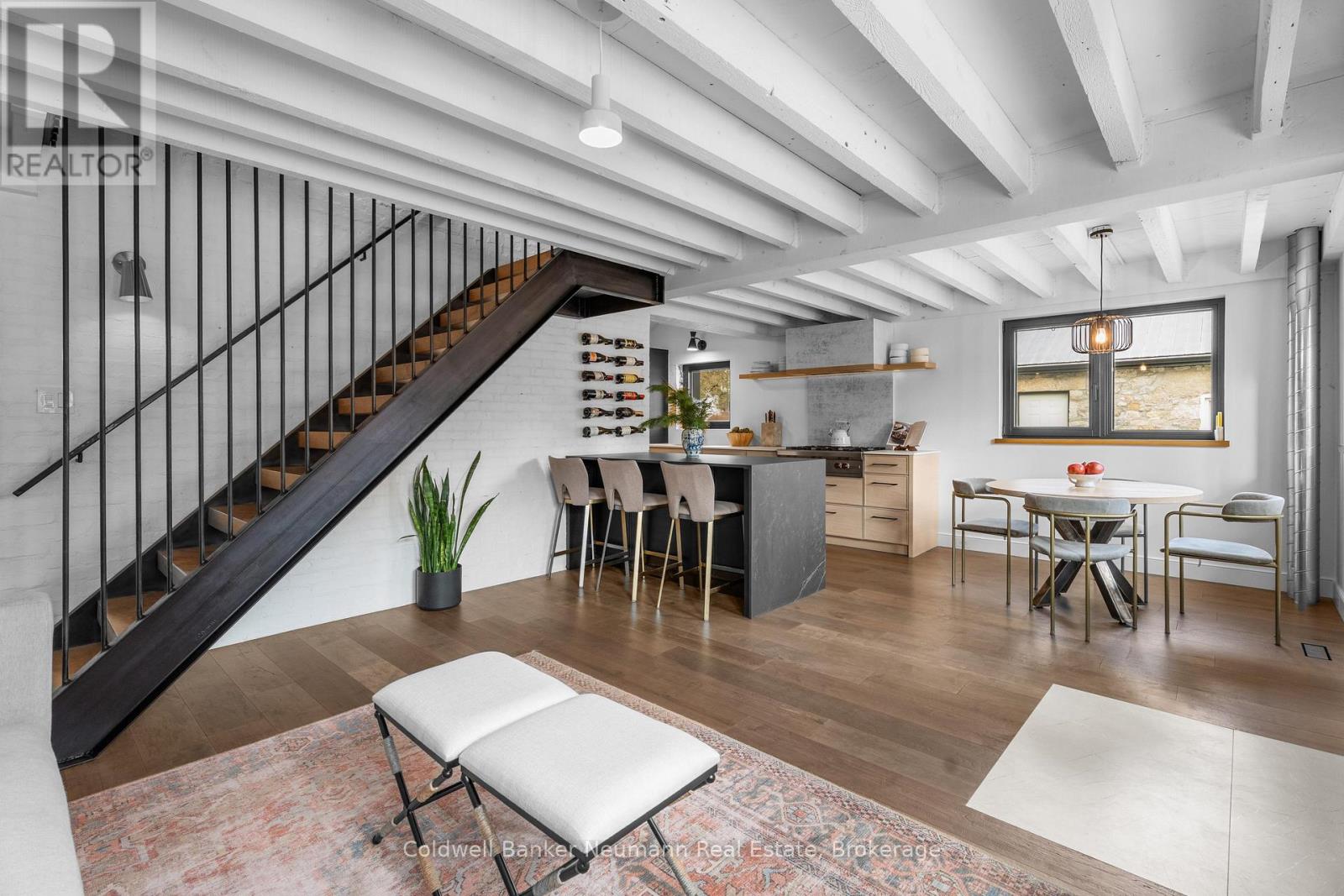 Welcome to a truly exceptional property in the heart of Arkell, where history, craftsmanship, and modern efficiency come together. Originally built in the 1800s and once home to a local blacksmith shop, this one-of-a-kind residence has been thoughtfully renovated to preserve its character while delivering outstanding comfort and performance. Reimagined using high-performance, Passive House-inspired building principles, the home was upgraded with a strong focus on the building envelope, ventilation, durability, and indoor air quality. The result is a remarkably energy-efficient, quiet, and comfortable home with consistent temperatures year-round. Inside, the main living space has been opened into a bright, cohesive kitchen and living area that blends contemporary design with preserved century details. Original rafters, exposed brick, and a striking floating staircase add architectural interest, while high-end appliances-including a Wolf cooktop, Fisher & Paykel refrigerator, wall ovens, and a built-in coffee maker-make the kitchen ideal for everyday living and entertaining. A rear addition with cathedral ceilings, moody finishes, and a fireplace creates a cozy, chalet-inspired retreat. Beyond its beauty, the home's performance truly sets it apart, featuring triple-pane windows, a continuous air barrier with thick exterior insulation, and a heat-recovery ventilation system for enhanced comfort, sound insulation, and energy savings. Set on two separate deeds with commercial zoning, the property offers flexibility for business use, live/work potential, or future development. A detached 900 sq. ft. heated shop provides year-round functionality, while the expansive landscaped yard offers space to relax, entertain, or expand. Rich in history, meticulously renovated, and full of opportunity, this is a rare and remarkable legacy property. (id:63357)