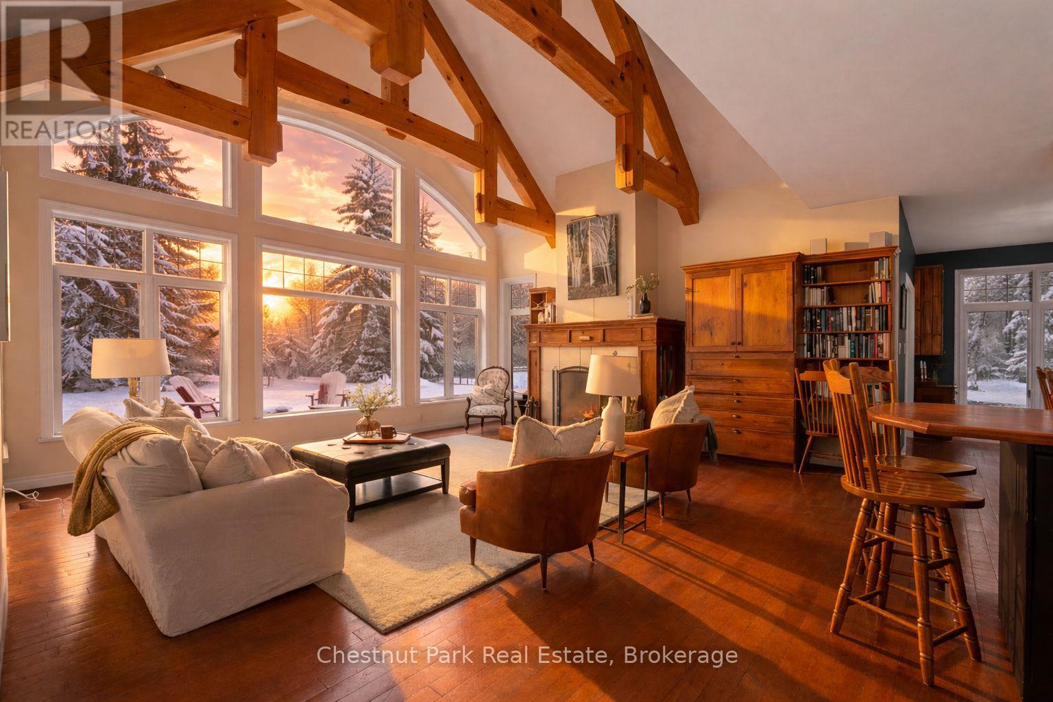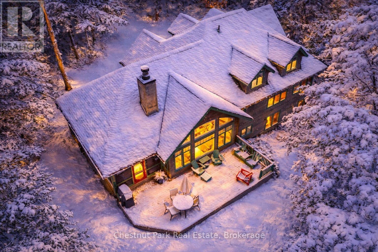 Where Stories Begin and Memories Stay: A Family Riverfront Retreat on the Black River Own it solo or share it with family or friends the magic of Muskoka is best when experienced together. Nestled along 405 feet of private shoreline with breathtaking westerly sunsets, just outside Bracebridge, this exceptional property offers not one, but two distinct dwellings, making it the perfect setting for multi-generational living, shared ownership, or a timeless family getaway.The main year-round residence, built in 2005, welcomes you with a warm timber framed accents design and soaring windows that flood the space with natural light and frame the beauty of the river beyond. Its open-concept layout is both bright and inviting, with a main floor primary suite, three additional bedrooms upstairs, and two dens below. A stunning stone fireplace anchors the living space, while a Muskoka room extends your living area into the trees perfect for relaxing to the sounds of the forest or gathering for evening games and laughter. The lower level also features a large games room, a formal living room, and walkout access that keeps you effortlessly connected to the outdoors. Steps away, the 1974 log cabin stands as a testament to decades of family joy. Lovingly preserved, it offers three generous bedrooms, a 3-piece bath, its own Muskoka room, and a storybook setting right at the rivers edge. Here, children catch frogs by day and roast marshmallows by the campfire under the stars by night. The walls echo with laughter, and the beams hold generations of memories. With no other structures in sight, this is your own hidden paradise where peace, privacy, and natural beauty converge. Whether you're seeking a peaceful year-round home, a multi-generational compound, or an investment in connection and nature, this property delivers the lifestyle only Muskoka can provide. Don't miss your chance to make Muskoka HOME! (id:63357)
