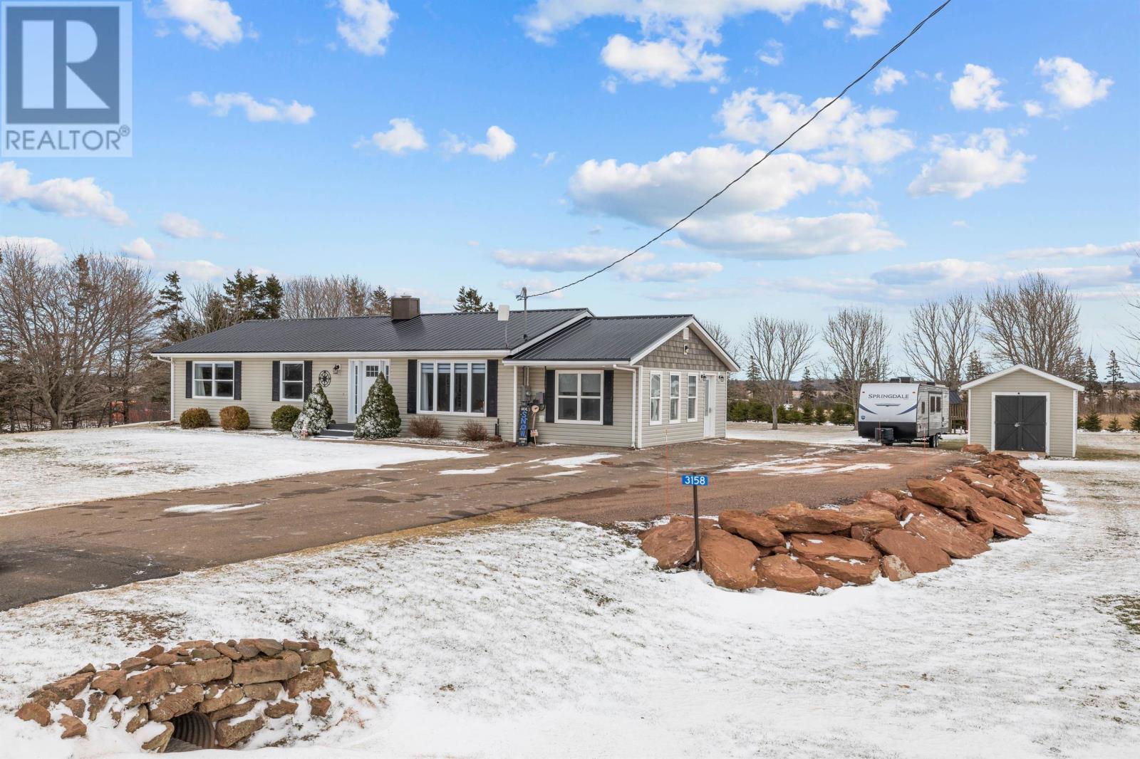 Welcome to 3158 Route 8 in Grahams Road, a truly exceptional bungalow that has never been offered to the market before and is completely move-in ready inside and out. This beautifully maintained and thoughtfully updated home offers an ideal blend of modern comfort efficiency, and peaceful country living. The heart of the home is the recently renovated kitchen featuring stainless steel appliances, ample cabinetry, and a stylish tile backsplash that flows seamlessly into bright, inviting living spaces ideal for everyday living and entertaining. The main-level living room features a built-in shelving unit with an electric fireplace, creating a warm, inviting focal point, while pot lights throughout the home enhance the home's bright, modern feel. The main level includes three well-sized bedrooms, including a spacious primary suite with a newly renovated ensuite bathroom, complete with a tiled shower and contemporary finishes. The fully finished basement adds excellent versatility with a fourth bedroom, a large rec room, an oversized laundry room, and a dedicated workshop area with extensive storage, making it ideal for hobbies, projects, and organization. Major efficiency upgrades include a 200-amp electrical service with a generator hookup, solar panels that significantly reduce electrical costs, and a heating system that hardly burns any oil, resulting in very affordable operating costs and low property taxes, along with a full metal roof that has just been added for long-term durability and peace of mind. A recently added 22-by-12 sunroom provides a bright, relaxing space to enjoy year-round and opens onto a large back deck overlooking beautiful rolling country hills, offering privacy, tranquillity, and scenic views. Centrally located just 20 minutes from Summerside and 30 minutes from Charlottetown, making it an excellent choice for those who value lifestyle convenience and turnkey living. (id:63357)