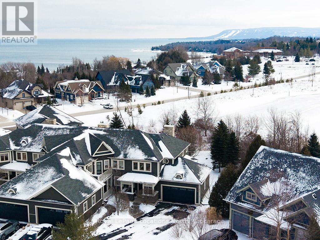 This sun-filled end-unit villa in sought-after Lora Bay offers a refined yet comfortable living experience, thoughtfully updated for today's lifestyle. The main floor is designed for easy living and entertaining, featuring an open layout with hardwood flooring throughout. The updated kitchen showcases sleek new stainless appliances, stunning countertops, and a contemporary backsplash, flowing effortlessly into the dining area and inviting living space. A gas fireplace with stone surround anchors the living room, with direct access to a private stone patio framed by mature trees and greenery-ideal for relaxing or hosting outdoors. A powder room completes this level. Upstairs, two generously sized bedrooms each enjoy their own private ensuite, creating excellent separation and comfort for owners and guests alike. Convenient upper-level laundry and additional storage add to the home's practicality. The finished lower level expands the living space with a spacious recreation room suitable for movie nights, hobbies, or guest overflow, complemented by a full 3-piece bathroom. An attached double garage provides plenty of space for vehicles, storage, and outdoor equipment. Residents enjoy the exceptional Lora Bay lifestyle, with access to waterfront amenities, golf, walking trails, and the clubhouse. Just minutes to the ski hills and the vibrant communities of Thornbury and Meaford. (id:63357)