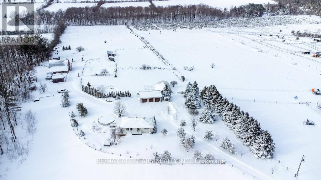 Welcome to 513 Hwy 35, Pontypool - a rare 27-acre hobby farm, offering privacy, infrastructure, and lifestyle. This well-developed rural property offers an exceptional blend of managed forest, agricultural opportunity, recreational enjoyment, and modern conveniences - ideal for hobby farmers, hobbyists, or those seeking a self-sustaining country lifestyle within commuting distance of the GTA. Enjoy approximately 2 km of groomed, walking trails that wind through the property, including 8 acres of maple hardwood forest, well suited for syrup production, firewood, and future timber income. A total of 6,700 softwood trees planted in 2019 supporting long-term sustainability and land value. The land is thoughtfully set up for rural living and agriculture, featuring a barn with loft, hydro, and water, suitable for horses or livestock, and a chicken coop with enclosed run, multiple campsites with outhouse, and open areas for bonfires and winter tobogganing. A 27' x 50' greenhouse with water and irrigation system and a variety of fruit trees further enhance the property's versatility. Infrastructure is extensive and well maintained, including a heated 3 bay garage/workshop with metal roof, a 10' x 10' heated/air-conditioned remote office overlooking the beautiful rolling countryside, a 20' x 15' bunkie, and a 20' x 20' implement shed, all in good condition. Outdoor living is a standout, with 1,000 sq ft deck with glass railing overlooking the 24' above-ground pool, 7 person hot tub, and a 6' bonfire pit with bench seating - perfect for entertaining or relaxing year-round. The carpet-free brick bungalow offers comfortable and functional living space, with 2 generous main floor bedrooms, a 4-piece bath, and an open concept kitchen, dining, and living area with walk out to the pool and deck, plus a practical mudroom. The finished lower level includes an updated, 3-piece bath, cozy family room with barn doors, office area, and a large primary suite with walkout to private patio. (id:63357)