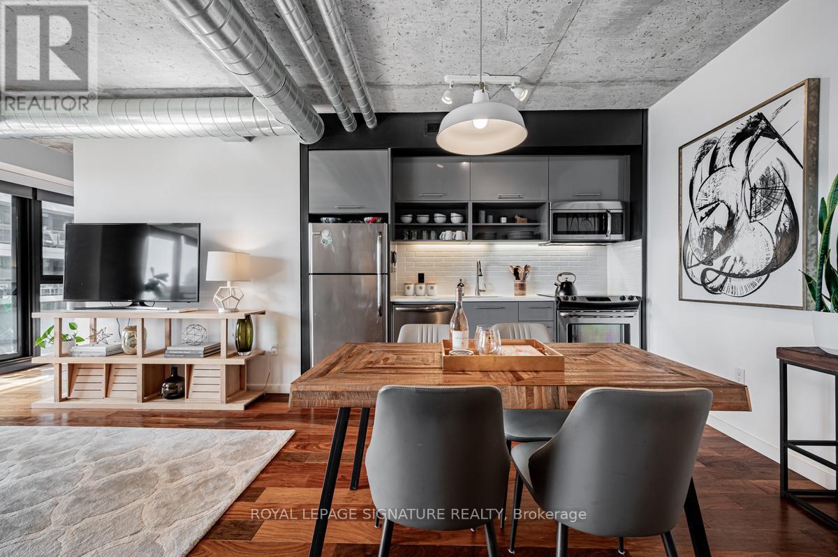 Welcome to River City Condos where sustainable living meets modern urban style! Step inside one of Toronto's first Gold LEED-certified residential communities, perfectly located in the city's vibrant downtown east. This bright and spacious suite offers true loft vibes, featuring exposed concrete ceilings and ducts, floor-to-ceiling windows, and hardwood floors throughout. Enjoy the ideal split-bedroom layout for added privacy and versatility. The primary suite features walk-through double closets and a fully tiled ensuite bath, while the second bedroom includes a double closet and a charming Juliette balcony. The modern kitchen has been thoughtfully updated with quartz countertops, a ceramic tile backsplash, and a stainless steel sink and faucet. Step out to your private balcony and take in the unobstructed southeast views - ideal for sunrise coffees or afternoon cocktails with friends! Residents of River City enjoy fantastic amenities, including a gym, party room, guest suites, and visitor parking - along with shared access to an outdoor pool and BBQ area. Nestled in the heart of the West Don Lands and Corktown neighbourhoods, you're just steps to Underpass Park and Corktown Commons. With a Walk Score of 98 and Bike Score of 97, you're perfectly positioned for city living - surrounded by great cafes, dining, shops, and recreation, plus direct access to the Lower Don Trail and other city bike paths. Bonus: this unit comes with two bike racks and two storage lockers - so you'll never run out of space! Only minutes to some of Toronto's coolest neighbourhoods - Distillery District, St. Lawrence Market, Leslieville, and East Chinatown, with quick access to transit and the DVP. (id:63357)