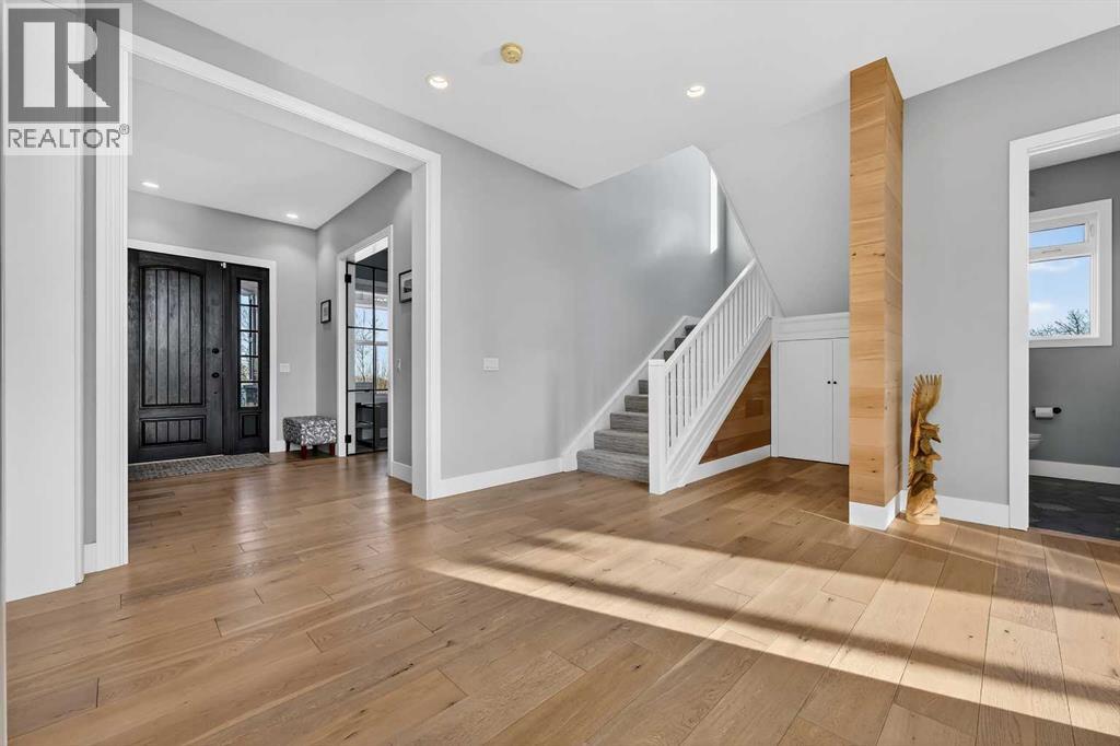 Welcome to a truly exceptional Foothills estate where refined design, modern luxury, and wide-open space come together in perfect balance. Set on 3.1 fully fenced and gated acres, this impressive 4,800 sq ft residence is tucked into one of the area’s most sought-after upscale subdivisions, offering privacy, convenience, and breathtaking views of the mountains, rolling valley, and even glimpses of the city skyline.The striking exterior immediately sets the tone with HardiePlank siding, extensive stone detailing, Gemstone lighting, a welcoming front porch, and a brand new 44'x20' cedar deck designed for entertaining and sunset views roughed in for an outdoor fireplace. A heated 4-car garage and a newly completed 1,420 sq ft detached workshop, architecturally matched to the home with freshly paved access, provide exceptional space for vehicles, hobbies, or ample storage.Step inside to soaring 20-foot ceilings, oversized windows, and sun-filled living spaces anchored by a modern fireplace. The main floor is thoughtfully laid out with a private home office, a grand living room, and a refined dining area with a statement feature wall and fireplace. The chef’s kitchen is fully outfitted with newer high-end appliances including a brand new chef's dream gas stove and dual ovens, quartz countertops, a large island, modern cabinetry and a walk-in pantry, perfectly blending function and style. A generous recreational flex space offers endless possibilities. An ideal games room, home gym, theatre, man cave, or easily converted into a main-floor bedroom with exterior access to the massive deck.Upstairs, retreat to a large bonus room with mountain views, the perfect place to relax and unwind. Two spacious bedrooms are connected by a beautifully finished Jack & Jill bathroom, while a designer laundry room adds everyday convenience. Further down the open hallway you’ll find the primary suite that is nothing short of spectacular!! Featuring west-facing mountain views, its own fire place, and the showstopping en-suite bathroom with top tier luxury, complete with a deep soaker tub, his and hers sinks and vanities, massive walk-in shower, designated water closet, and an expansive walk-in that truly has the WOW Factor.With 3 large bedrooms, 3.5 baths, multiple flex spaces for work, fitness, play, or entertaining, and remarkably efficient utilities, this home delivers both luxury and practicality. Enjoy nearby walking and quad trails, while being just 5 minutes to Okotoks, 7 minutes to Costco, 45 minutes to downtown Calgary, and 50 minutes to the airport.This property truly stands above the rest offering an unmatched combination of location, craftsmanship, space, and lifestyle. Schedule your private tour today and experience a home that genuinely has it all. (id:63357)