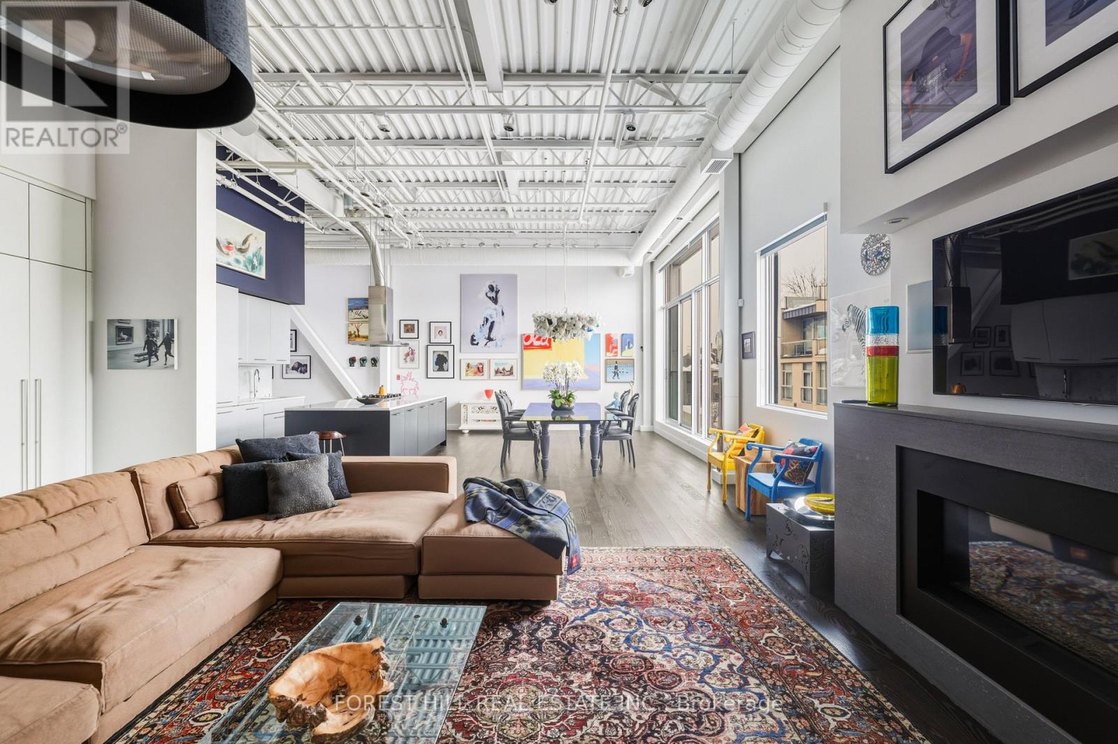 Come home to one of the city's most stunning architectural masterpieces. Set within an intimate boutique building of just seven exclusive residences, this design-driven loft offers discretion and privacy just steps from Toronto's most iconic neighborhoods, including The Annex, Yorkville, and Casa Loma.Positioned on the top floor and defined by dramatic 15-foot ceilings, this showpiece lives more like a private home than a condominium. The extraordinary space is anchored by a sleek gas fireplace and wrapped in floor-to-ceiling windows that flood the interior with natural light. Clean lines, voluminous proportions, and an effortless open-concept layout create an atmosphere that is both refined and inviting.The Schiffini chef's kitchen is contemporary and functional, featuring an oversized island with extensive integrated storage and a full suite of top-of-the-line Miele appliances. Designed for both elevated entertaining and everyday living, it seamlessly anchors the main living area.Two generously sized bedrooms each feature a private ensuite, providing rare symmetry and privacy. The primary suite is a true retreat, complete with a large walk-in closet and a spa-caliber bath featuring a deep soaker tub, steam shower, and floor-to-ceiling tile detailing. A beautifully appointed powder room adds convenience for guests.Outdoor living includes a private balcony plus two Juliet balconies, enhancing the indoor-outdoor flow and reinforcing the loft's airy, architectural presence.Professionally curated throughout, the residence perfectly blends authentic industrial character with elevated modern finishes. Two parking spaces and a large private locker complete this exceptional offering. For those with refined taste seeking a truly unique space to live and entertain, this property is a dream come true. (id:63357)