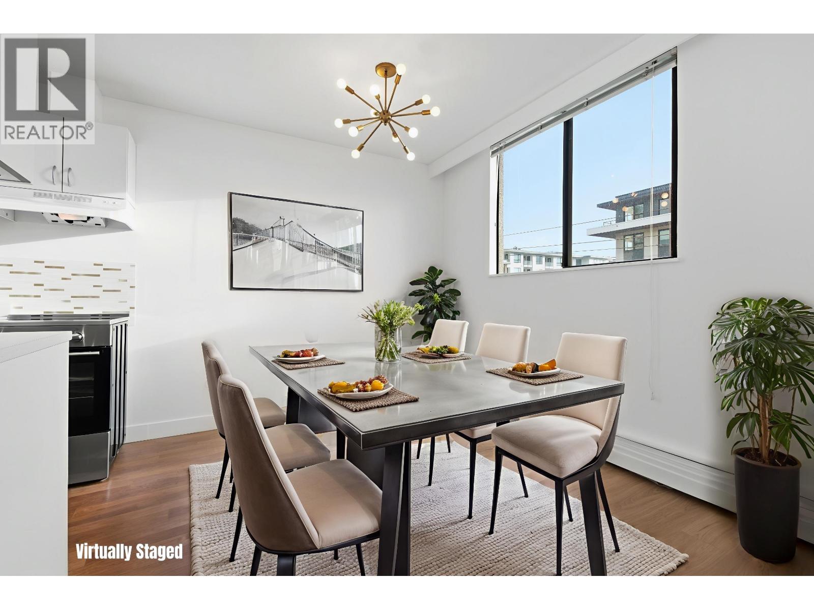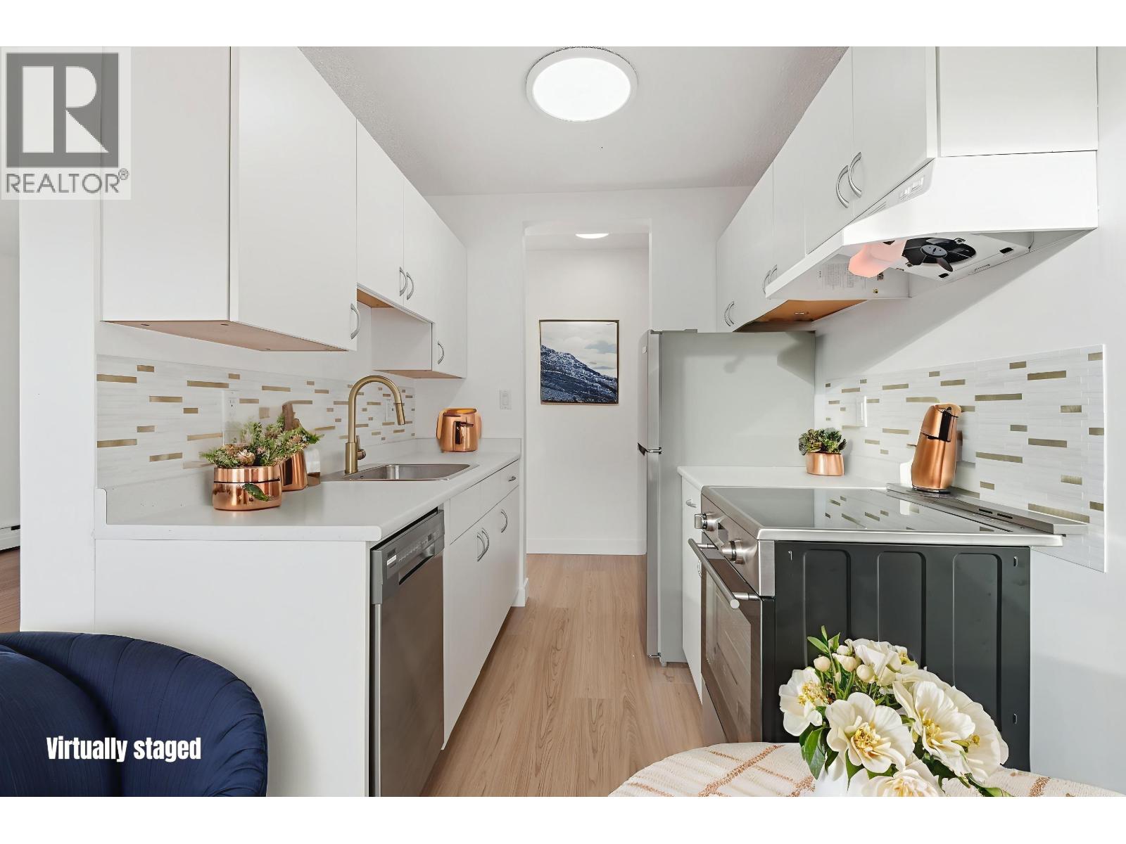 Vancouver Harbour views await from this tastefully updated 2-bedroom home. New luxury vinyl plank flooring flows from the entry past the updated bathroom into a bright living room with sliding glass doors to a covered sundeck overlooking the water. A separate dining area sits beside the refreshed galley kitchen featuring new cabinetry, stainless steel appliances, induction stove, and contemporary tile backsplash with gold accents and designer faucet. Both bedrooms enjoy sunny exposure and beautiful water views. Building amenities include a fitness centre, sauna, hobby room, and large shared laundry. Surrounded by restaurants and conveniences, just 8 minutes to Lonsdale Quay, 12 minutes to the SeaBus, and 4 minutes to Gracie Jiu Jitsu. 2 cats or 1 dog allowed. 3D virtual tour at Realtor's site. (id:63357)