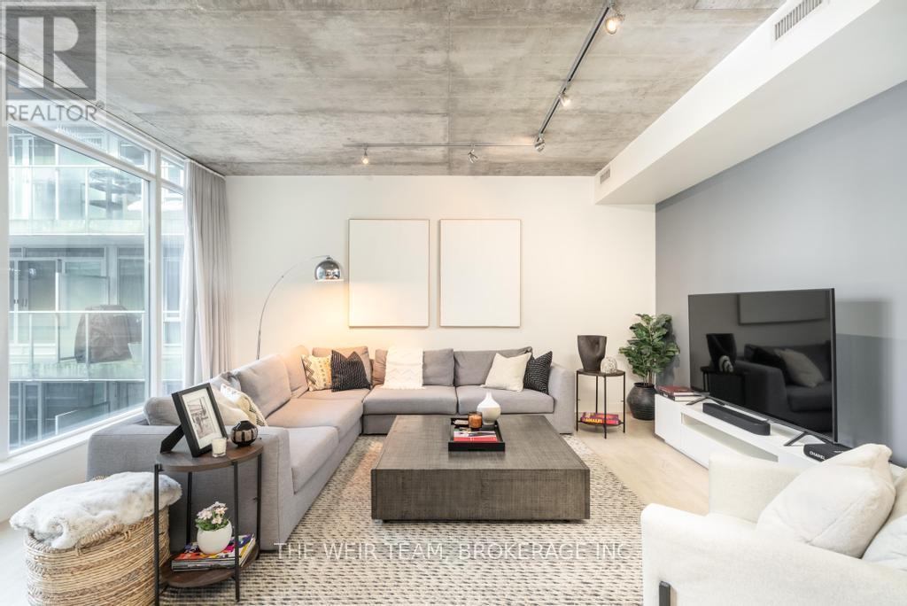 This stunning open-concept loft-style condo is located in one of King West's most sought-after buildings and offers an exceptional layout with hardwood floors throughout, concrete ceilings, and an abundance of natural light. The spacious living and dining areas both provide access to the balcony, making it ideal for entertaining.The gourmet kitchen is truly one of a kind, featuring an oversized centre island exclusive to this unit, complete with a stainless steel countertop, extensive counter space, and exceptional storage. The primary bedroom offers generous space, floor-to-ceiling windows, a large walk-in closet, and a four-piece ensuite.Enjoy 24-hour concierge service with a friendly and attentive staff, all in a prime downtown location just steps from restaurants, nightlife, public transit, and everything the city has to offer. Welcome to your next home. (id:63357)